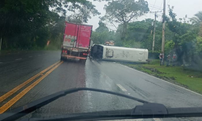 Na manhã desta segunda-feira (1º), um micro-ônibus se envolveu em um acidente e tombou na BR-415, no trecho que liga Ilhéus a Itabuna. O incidente ocorreu nas imediações do Salobrinho, em uma curva acentuada, por volta das 8h30.